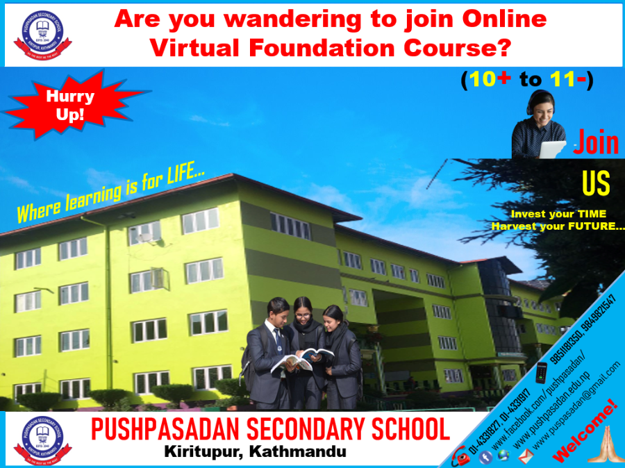 Dear SEE-GRADUATES, Pushpasadan Secondary School proudly announces New Registration Open for grade - XI for the academic session - 2078/79. The choice of your subjects in Science & Management streams is OPEN! now. Please click the ASMISSION button to the right in order to get registered for ONLINE FOUNDATION COURSE in time. The seats are limited. Invest your TIME, harvest your FUTURE.